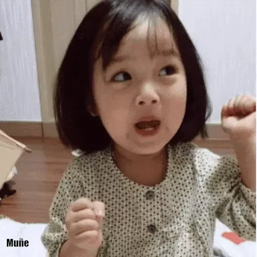 Menina pequena com cabelo preto e expressão surpresa, vestindo uma blusa branca com estampas pretas. Ela tem as mãos levantadas e a boca aberta.