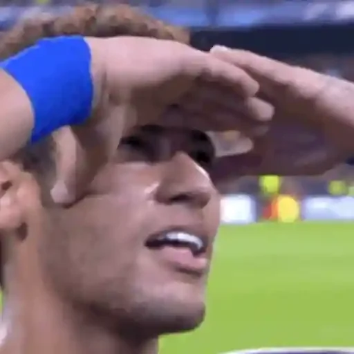 Jogador de futebol comemorando, vestindo camisa azul, com outros jogadores ao fundo, em um estádio.