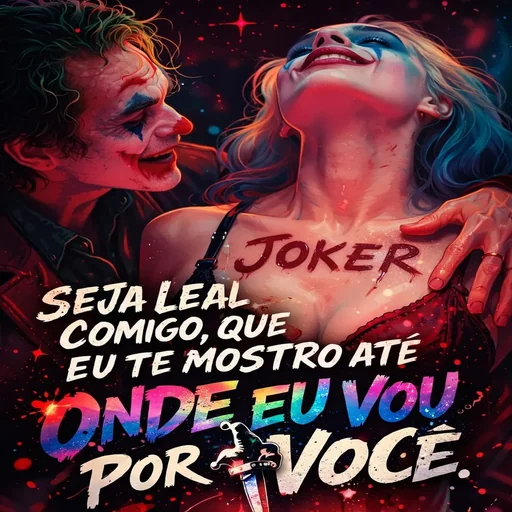 Imagem do Coringa e Harley Quinn com o texto 'JOKER' no peito dela e 'SEJA LEAL COMIGO, QUE EU TE MOSTRO ATÉ ONDE EU VOU POR VOCÊ.'