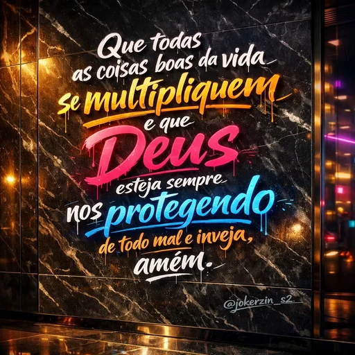Uma mensagem de fé com texto colorido em português sobre um fundo noturno de cidade. O texto diz: 'Que todas as coisas boas da vida se multipliquem e que Deus esteja sempre nos protegendo de todo mal e inveja, amém.'