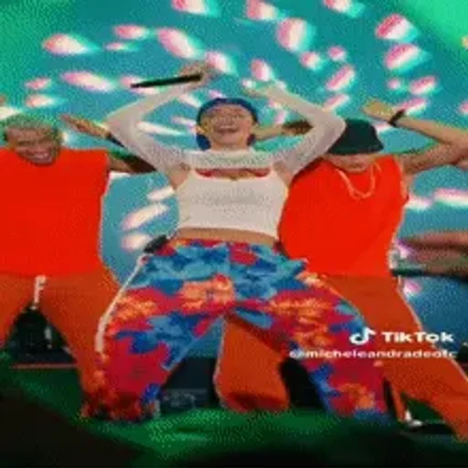 Uma mulher com roupas coloridas dança com dois homens ao fundo, todos com expressão de diversão. A imagem tem um efeito de luzes coloridas ao fundo e a marca do Tik Tok.