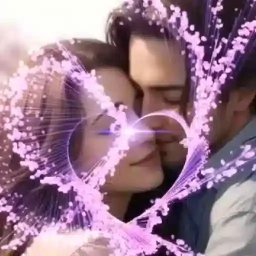 Um casal se beijando com um coração roxo e rosa ao fundo.