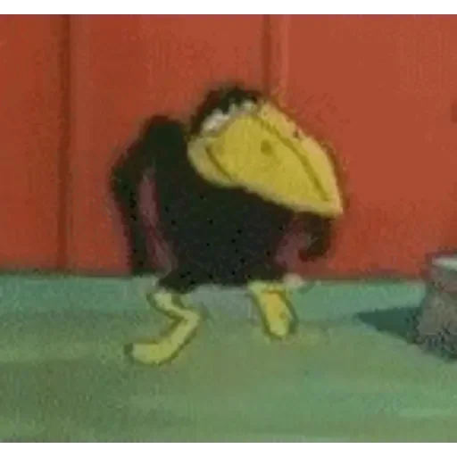 Um pássaro cartoon com bico amarelo e corpo preto dançando em frente a uma parede laranja.