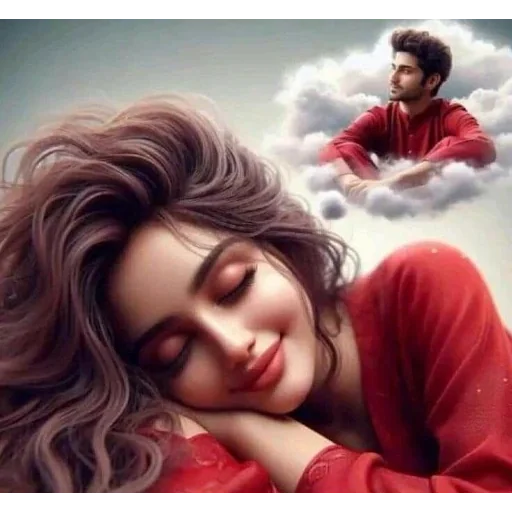 Mulher deitada com a cabeça apoiada na mão, sonhando com um homem que aparece em uma nuvem acima dela. Ambos vestem roupas vermelhas.