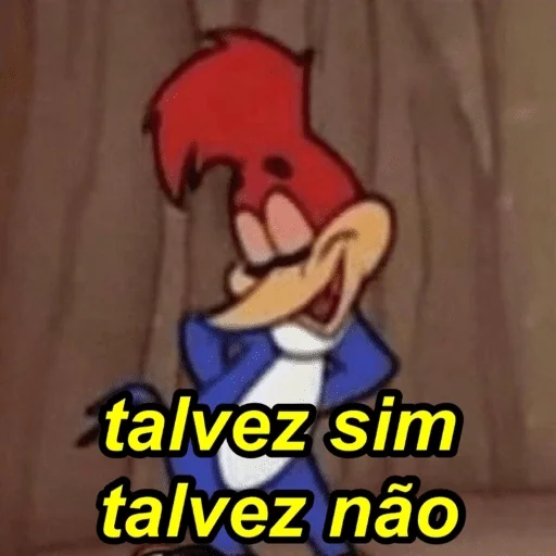 Personagem de desenho animado com penas vermelhas, bico grande e óculos, vestido com um blazer azul e uma camisa branca. A imagem traz o texto 'talvez sim talvez não'.