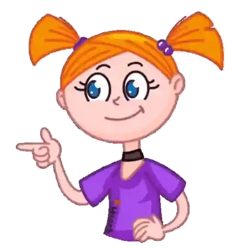 Menina de cabelos laranjas em dois coques, com olhos azuis e uma blusa roxa, apontando para a esquerda com um sorriso.