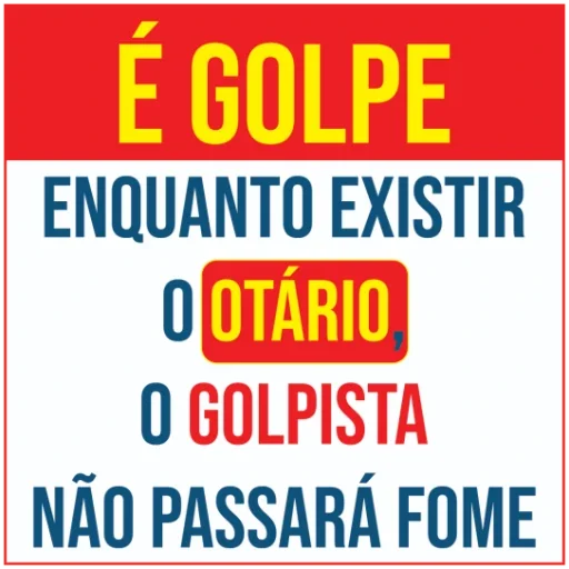 Placa com texto colorido que diz 'É GOLPE ENQUANTO EXISTIR O OTÁRIO O GOLPISTA NÃO PASSARÁ FOME'.