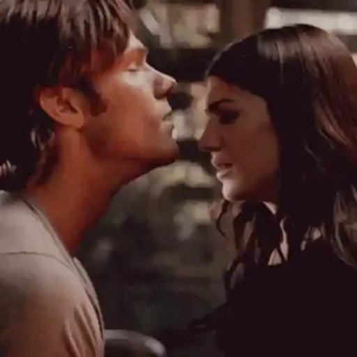 Cena de um casal se beijando, o homem com cabelo castanho e camiseta clara, a mulher com cabelo escuro e expressão surpresa.