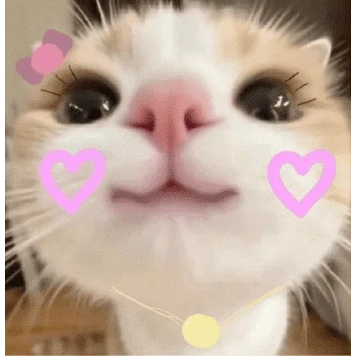 Gato com olhos grandes e coração rosa nas bochechas, cílios postiços e corações roxos no canto dos olhos.
