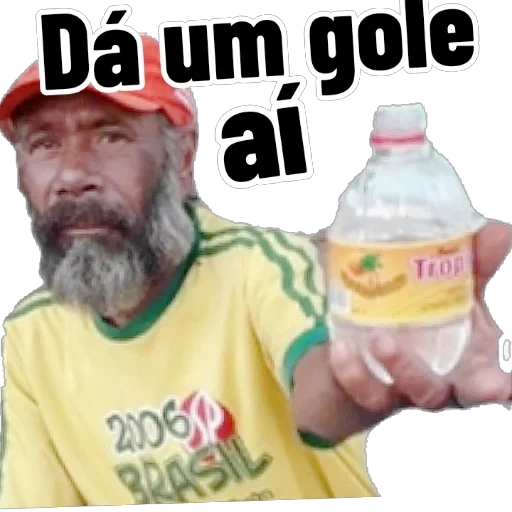 Um homem mais velho com barba grisalha e boné vermelho, vestindo uma camisa amarela com '2016 BRASIL', oferece uma garrafa de água com um rótulo amarelo e laranja, com o texto 'Dá um gole aí'.