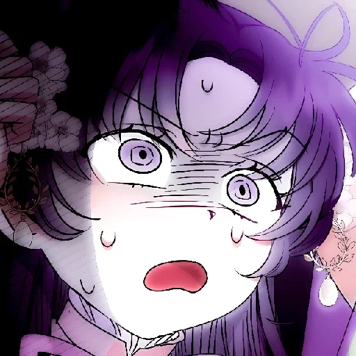 Garota de olhos roxos e cabelo roxo, com expressão de surpresa ou choque, boca aberta e bochechas rosadas.