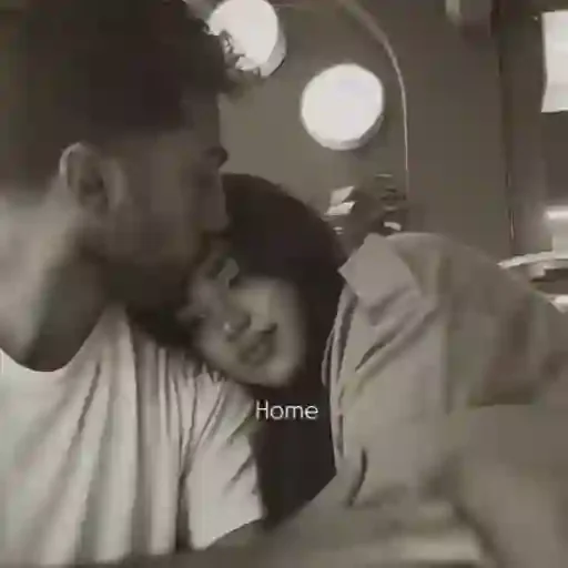 Um casal se beijando em preto e branco, com o texto "Home" sobreposto.