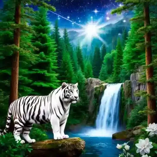Um tigre branco em uma rocha em frente a uma cachoeira em uma floresta densa e iluminada por uma lua brilhante no céu noturno.
