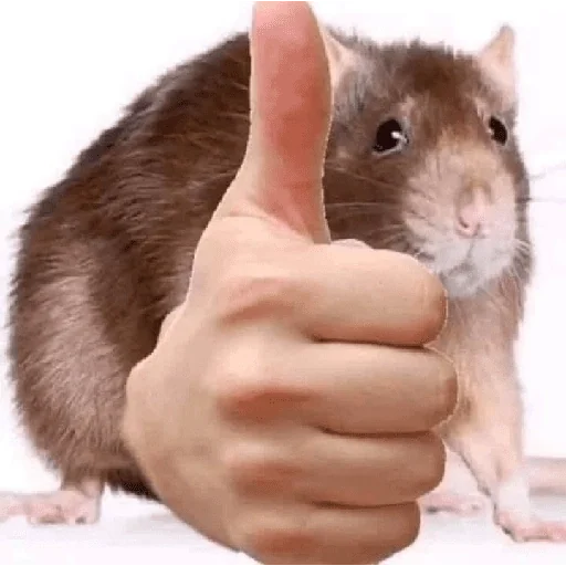 Um rato marrom e branco olha para a câmera ao lado de uma mão humana dando um polegar para cima.
