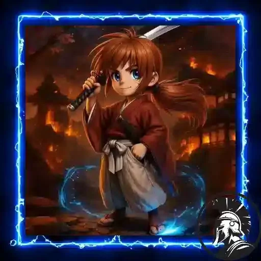 Uma menina com cabelos castanhos longos e olhos azuis, vestida com um quimono vermelho e uma faixa cinza, segura uma espada samurai em uma mão. Ela está em frente a um cenário de chamas e edifícios em chamas.