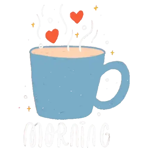 Uma xícara azul com líquido bege e dois corações vermelhos saindo do vapor, com a palavra 'morango' embaixo.