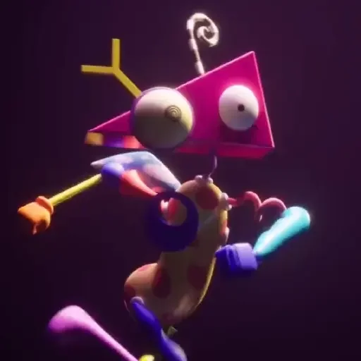 Um robô colorido com corpo de partes de diferentes cores e formatos, com olhos grandes e redondos, em uma pose dinâmica.