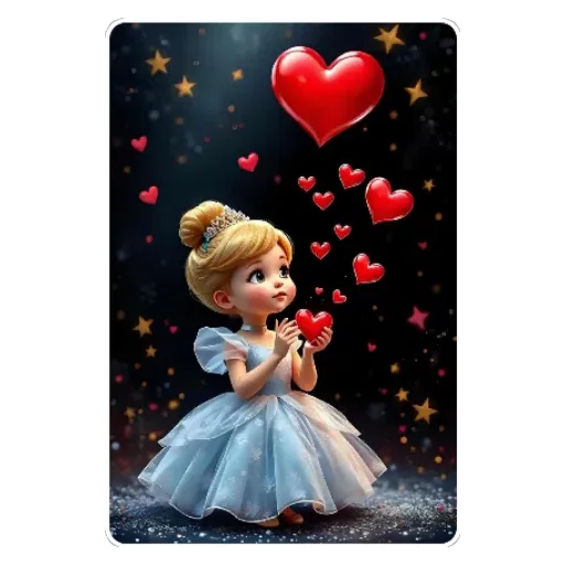 Uma menina vestida de princesa, com um vestido azul claro, segura um coração vermelho enquanto olha para um grande coração vermelho flutuante acima dela, cercado por estrelas e pequenos corações.