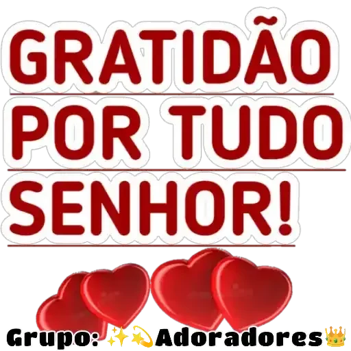 Uma imagem com a frase 'GRATIDÃO POR TUDO SENHOR!' em letras grandes vermelhas e três corações vermelhos abaixo, com texto adicional 'Grupo: Adoradores' na parte inferior.