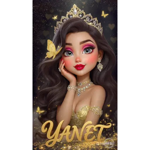 Uma mulher loira com tiara, maquiagem colorida e vestido dourado. Ela está com a mão no rosto e há uma borboleta amarela ao lado de sua cabeça. O nome 'YANET' está escrito em ouro na parte inferior.