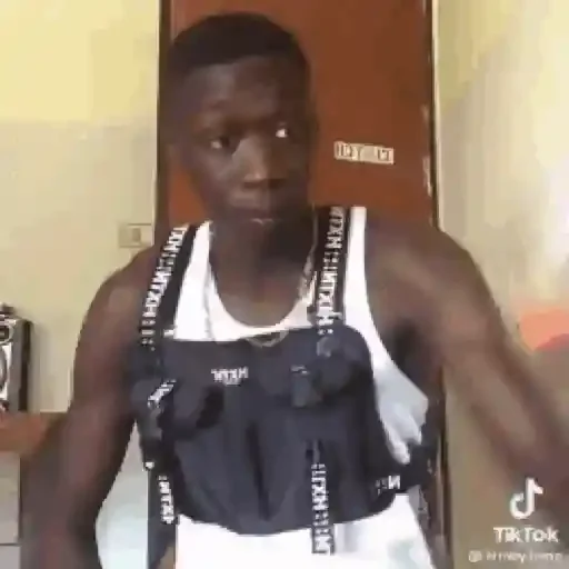 Um homem jovem com pele escura e cabelo curto, vestindo um colete preto com alças brancas e uma camiseta branca, em frente a uma porta castanha, com o logotipo do Tik Tok no canto inferior direito.