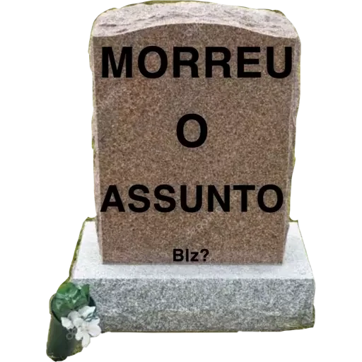 Túmulo de pedra com as palavras 'MORREU O ASSUNTO' em preto. Abaixo, 'Blz?'. Uma pequena planta brota de um canto.