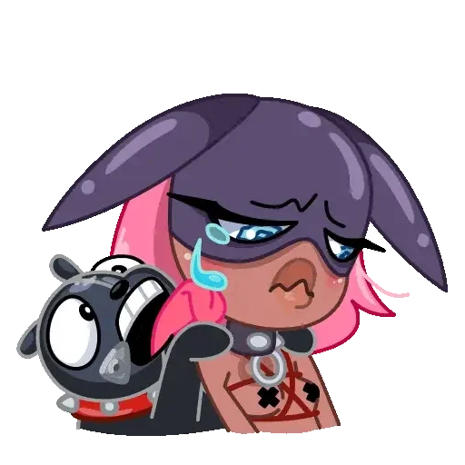 Uma garota de cabelo roxo e rosa com um animal preto ao lado, parecendo zangada e com uma lágrima azul no rosto.