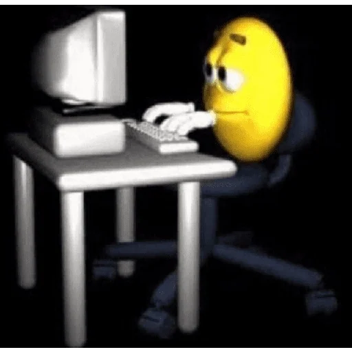 Um emoji amarelo oval sentado em uma cadeira de escritório, trabalhando em um computador com uma expressão de desânimo.
