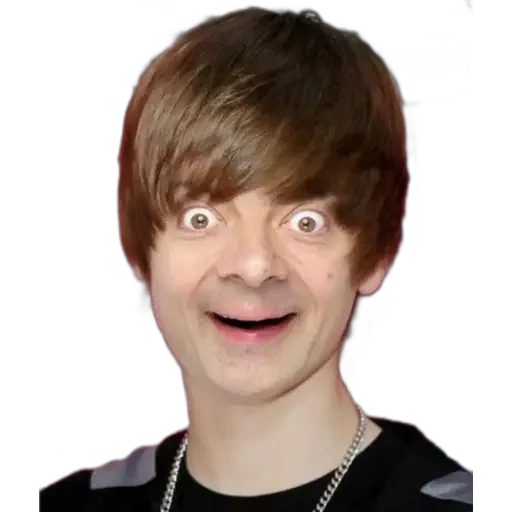 Um jovem com cabelo castanho e olhos esbugalhados, vestindo uma camiseta preta e uma corrente de prata, com uma expressão de surpresa ou choque.