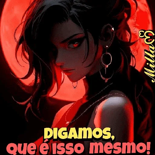 Uma mulher com cabelos pretos e olhos vermelhos, com uma expressão séria, em frente a uma lua vermelha. O texto 'DIGAMOS, que é ISSO mesmo!' aparece em destaque.