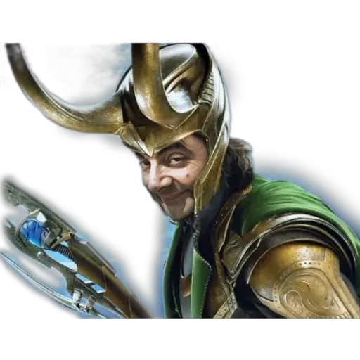 Loki, deus nórdico, com armadura dourada e capacete com chifres, empunhando uma arma.