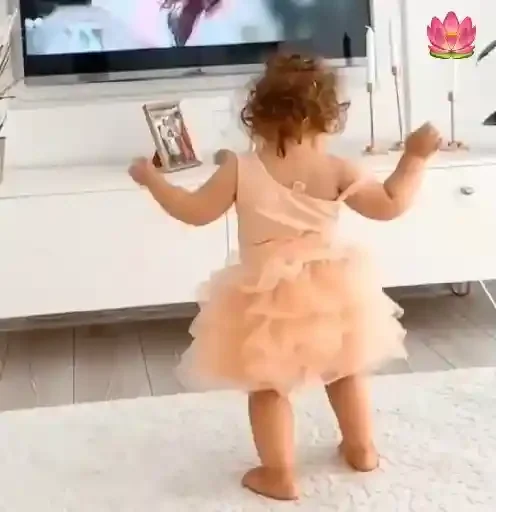 Uma menina pequena de vestido rosa claro está de costas, segurando um quadro e assistindo TV.