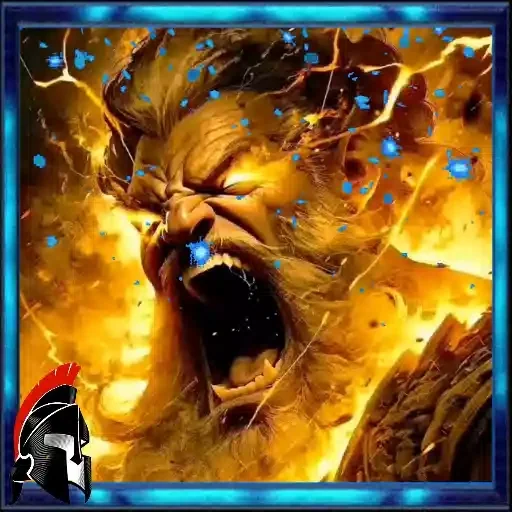 Rosto de um homem com expressão de raiva, boca aberta e olhos fechados, cercado por chamas e faíscas azuis.