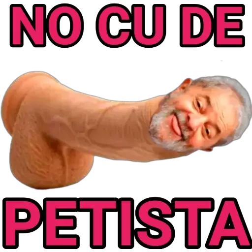 Um boneco de plástico com a cabeça de um homem grisalho e barba, com texto 'NO CU DE PETISTA' em letras grandes e rosadas.