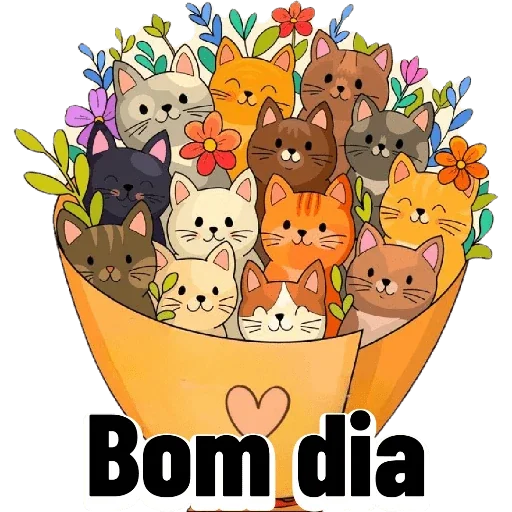 Um buquê de gatos fofos em um envelope amarelo com um coração, rodeados de flores coloridas, com a frase 'Bom dia' embaixo.