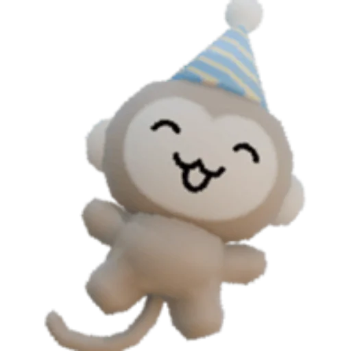 Macaco cinzento com um chapéu de festa azul e listras amarelas, com expressão feliz e olhos fechados.