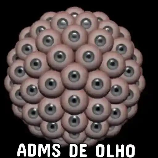 Uma esfera composta por muitos olhos cinzas com pupilas pretas, dispostos em uma formação arredondada. Abaixo, o texto 'ADMS DE OLHO' em branco.