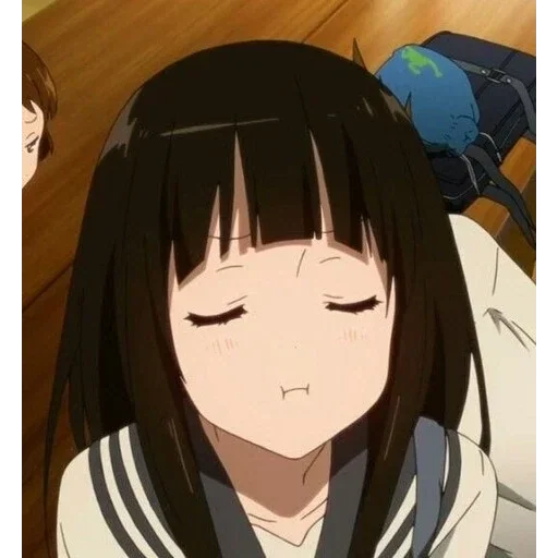 Uma garota de anime com cabelos pretos longos e franja, olhos fechados e uma expressão facial neutra, vestindo um uniforme com listras pretas e brancas.