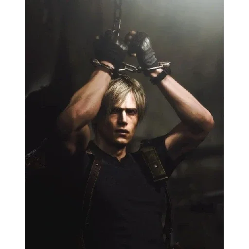 Personagem de jogo com cabelo castanho claro e olhos sérios, vestindo roupas pretas e segurando correntes.