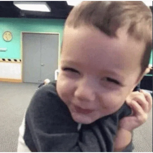 Menino com expressão engraçada, fazendo careta e com a mão no rosto, em um ambiente com paredes azuis e uma porta cinza.