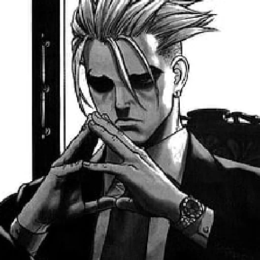 Personagem de anime com cabelo espetado e expressão séria, vestindo um casaco e uma camisa listrada, com um relógio no pulso e fazendo um gesto com as mãos.