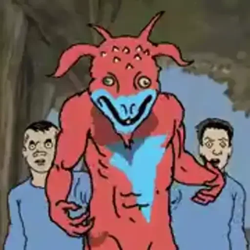Um monstro vermelho com máscara azul e dois homens assustados ao fundo.