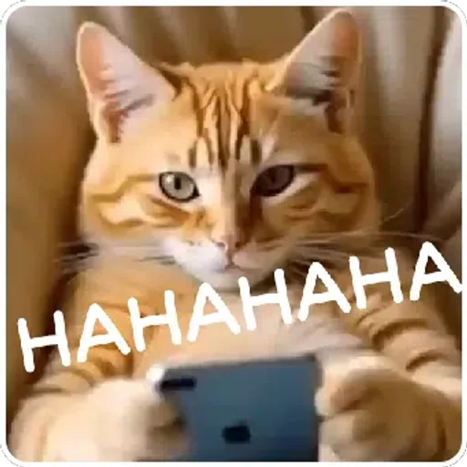 Gato laranja com expressão de surpresa ou desconfiança, segurando um celular e com o texto "HAHAHAHA" sobreposto.