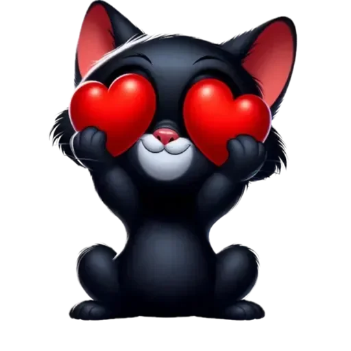 Gatinho preto com olhos de coração vermelho, sentado e sorrindo.