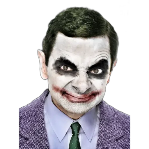 Rosto de um homem com maquiagem de palhaço, semblante Joker, com olhos pretos e sorriso forçado, vestindo um blazer roxo e gravata verde.
