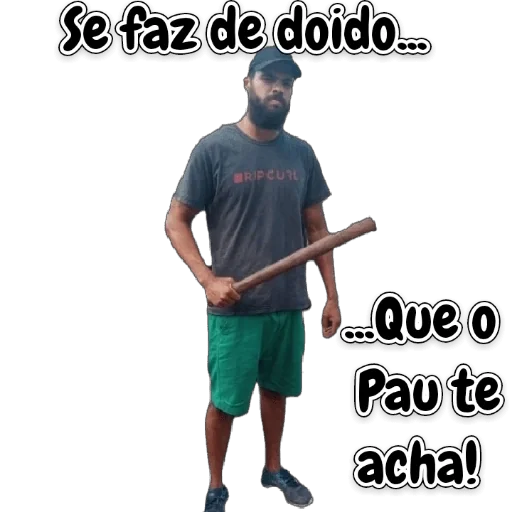 Um homem com barba e boné, vestindo uma camiseta cinza e bermuda verde, segura um pedaço de madeira. A imagem tem o texto 'Se faz de doido... ...Que o Pau te acha!'