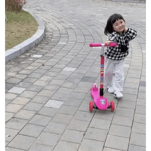 Menina de cabelos pretos e pretos, vestindo uma camisa xadrez preta e branca e calça branca, andando de scooter rosa em uma calçada de tijolos.