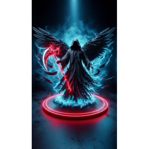 Anjo da morte com asas abertas e foice em chamas, em um círculo vermelho com fundo azul e luzes.