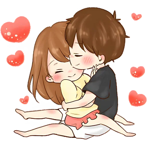 Um casal de anime, o homem com cabelo castanho e camisa preta beijando a mulher com cabelo castanho e camisa amarela, rodeados de corações vermelhos.