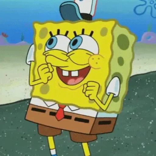 Esponja Bob com expressão cômica, olhos arregalados e sorriso torto, parecendo surpreso ou confuso.